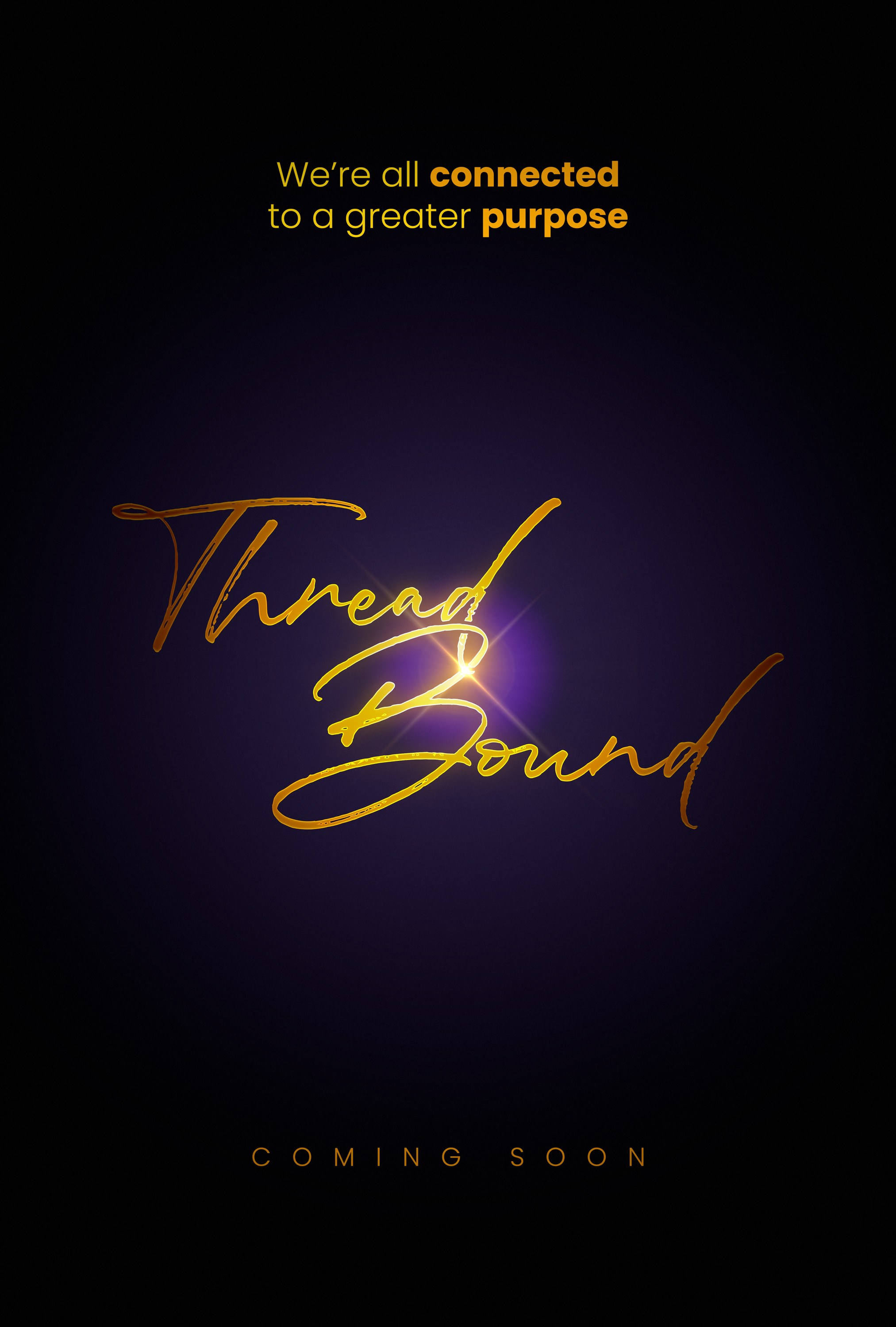 Thread Bound teaser poster - gold script logo on deep purple with the line 'We're all connected to a greater purpose'.